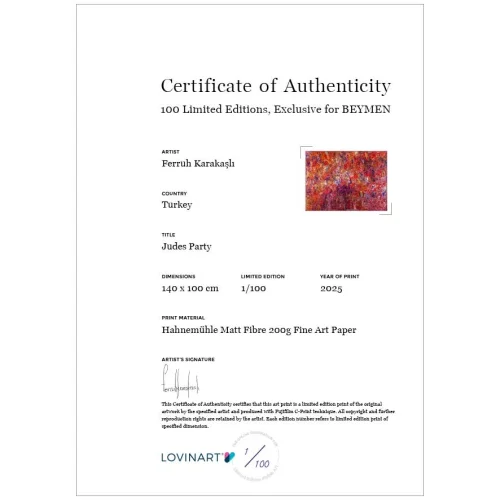 LIMITED EDITION ART PRINTS An edition artwork is defined as a copied or verbatim reproduction of an original work. While producing in limited editions, the number of editions of the work to be produced is determined in advance under the supervision of the artist who owns the work, and the work is not produced more than this number. CERTIFICATE OF AUTHENTICITY A limited edition artwork is sent to the art buyer with the artist's signature and the 'Certificate of Authenticity' indicated on which copy of which edition it is. In addition, all printing features, including the technique and quality with which it is produced, and the fine art paper used, are included on the certificate. MUSEUM-QUALITY PRINTS AND MODERN FRAMING OPTIONS Museum-quality archival pigment prints that we produce using Giclée (spraying) technique on only 200 grams of Hahnemühle fine art paper with world-class printing machines; They are fine art prints that have a lifespan of more than 100 years under normal room conditions. Acid-free and 100% cotton-based, Hahnemühle fine art papers, which give excellent results in terms of closeness to the original work in details and colors, are also guaranteed against fading. You can only order fine art prints of your works in rolls, and you can even choose the one that suits your taste from our modern frame alternatives and receive them ready to be hung. We make the framing process, which we carry out completely handcrafted and meticulously, with long-lasting, quality materials.