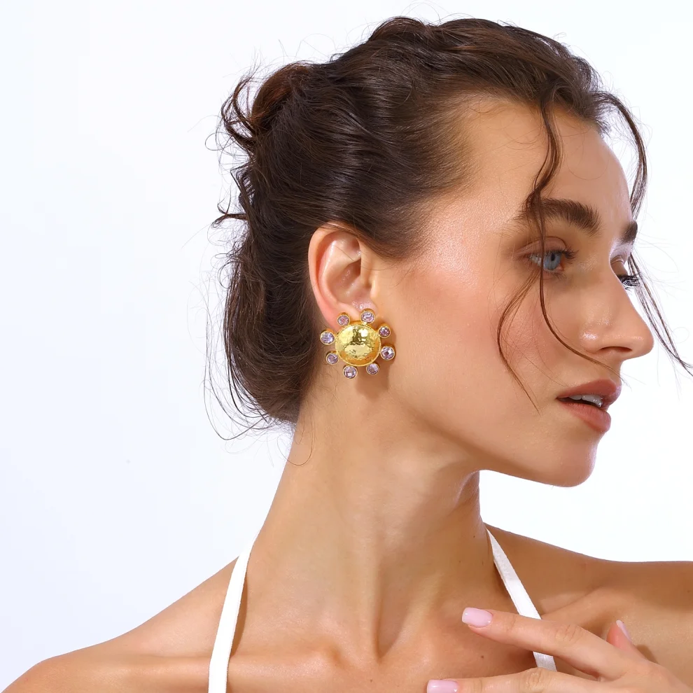Handcrafted from 24-karat gold-plated silver-blended stainless brass set with Swarovski stones Free of nickel, lead and cadmium The earring clips are made of non-allergenic gold-plated 925 silver Earrings with clips Measures: Total Diameter: 3.5 cm Approximate weight per earring: 11 g