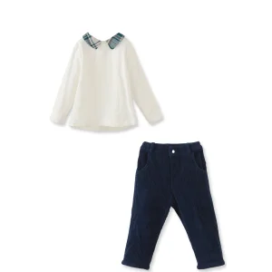 Two-piece tooling. Long sleeves with plaid collar detailing. It has two pat details on the front and studs at the back. Velvet trousers with half elasticated waist, buttons at the front and front pockets.