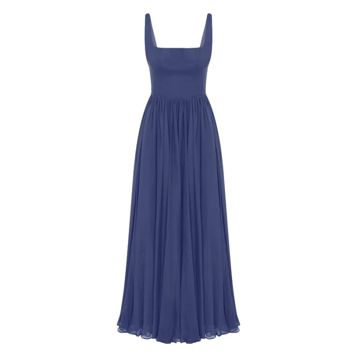 Silk Square Neck, Gathered Waist, Flared Midi Evening Dress