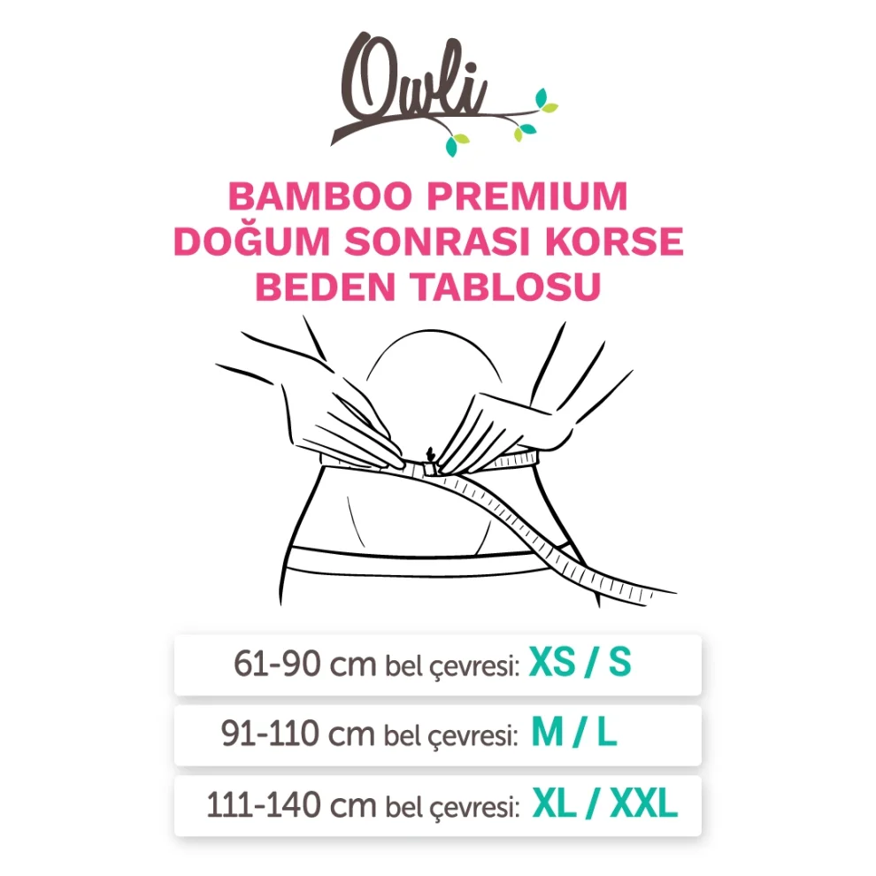 The Most Premium Way to Slim Down After Childbirth! Owli Postpartum Corset, with its antibacterial properties and breathable structure of bamboo The most premium way to tighten and slim after childbirth! Owli Bamboo Premium is one of the most effective solutions for Diastasis Recti* after childbirth with its increased firmness and renewed design. Thanks to its revamped and wider sidebands, the Owli Bamboo Premium is tighter. It is supportive to help relieve low back pain after childbirth. Owli Bamboo Premium is breastfeeding-friendly by design. Thus, you can continue your daily activities without taking off your corset. *Diastasis Recti is the partial or complete separation of the rectus abdominis muscle in the abdomen during pregnancy or after childbirth and can be seen in one out of every two women. Size Chart: XS/S: For waist circumference of 61-90 cm, M/L: For waist circumference of 91-110 cm, XL/XXL: Suitable for waist circumference of 111-140 cm. Note: The measurement should be made at the level of the belly button.