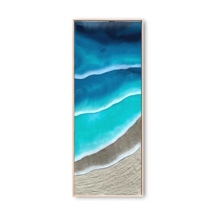 Five layer epoxy wave, with real sand beach texture and acrylic painting on wooden background. Each piece is handmade in our studio. The work will be sent without a frame. Since resin is a very fun but difficult material to work with, each piece develops its own character. Therefore, no two studies are similar to the other. Therefore, when you buy from our products, you will receive a special work just for you. It is recommended to display it in a place that does not receive direct sunlight.