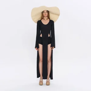 The Deep Slit Knit Dress offers a bold look with its deep slits extending to the navel on the skirt, while its long bell-shaped sleeves balance your proportions.