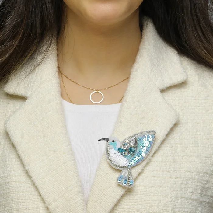 It is a leather back brooch designed with Italian sequins, asfor brand crystal stones, swarovski stones, Czech beads, dmc french embroidery, pave india, special stones. It is completely handcrafted. It will be sent in a special box. Dimensions: 8x7 cm