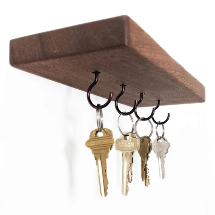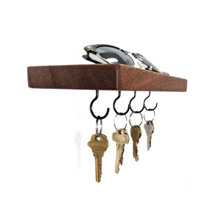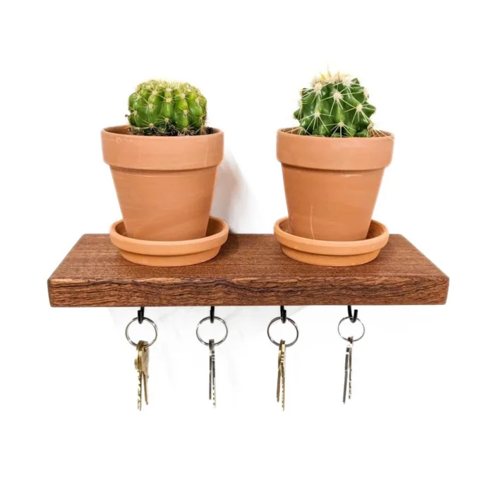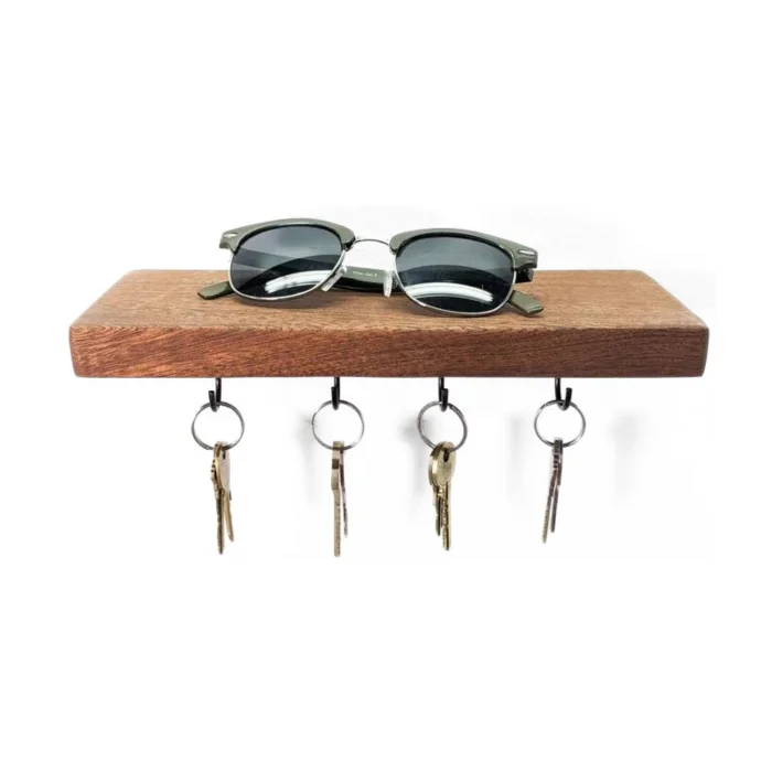 The handmade wooden shelf hook keychain is designed to beautify the entrance of your home with both its functionality and aesthetic appearance. Made of high-quality natural wood, this keychain adapts to any home with different width options. The shelf at the top offers extra space to put your wallet, glasses or decorative items. Sturdy hooks on the bottom help keep your keys organized and always within reach. It is made of solid beech wood and finished with natural oil. Our products are handcrafted by local artisans. Since it is made of solid wood, slight differences such as knots and color tones can be observed. Product Dimensions: Depth: 12 cm Width: 25 cm Width: Medium: 38 cm Width: Large: 50 cm Width: 60 cm